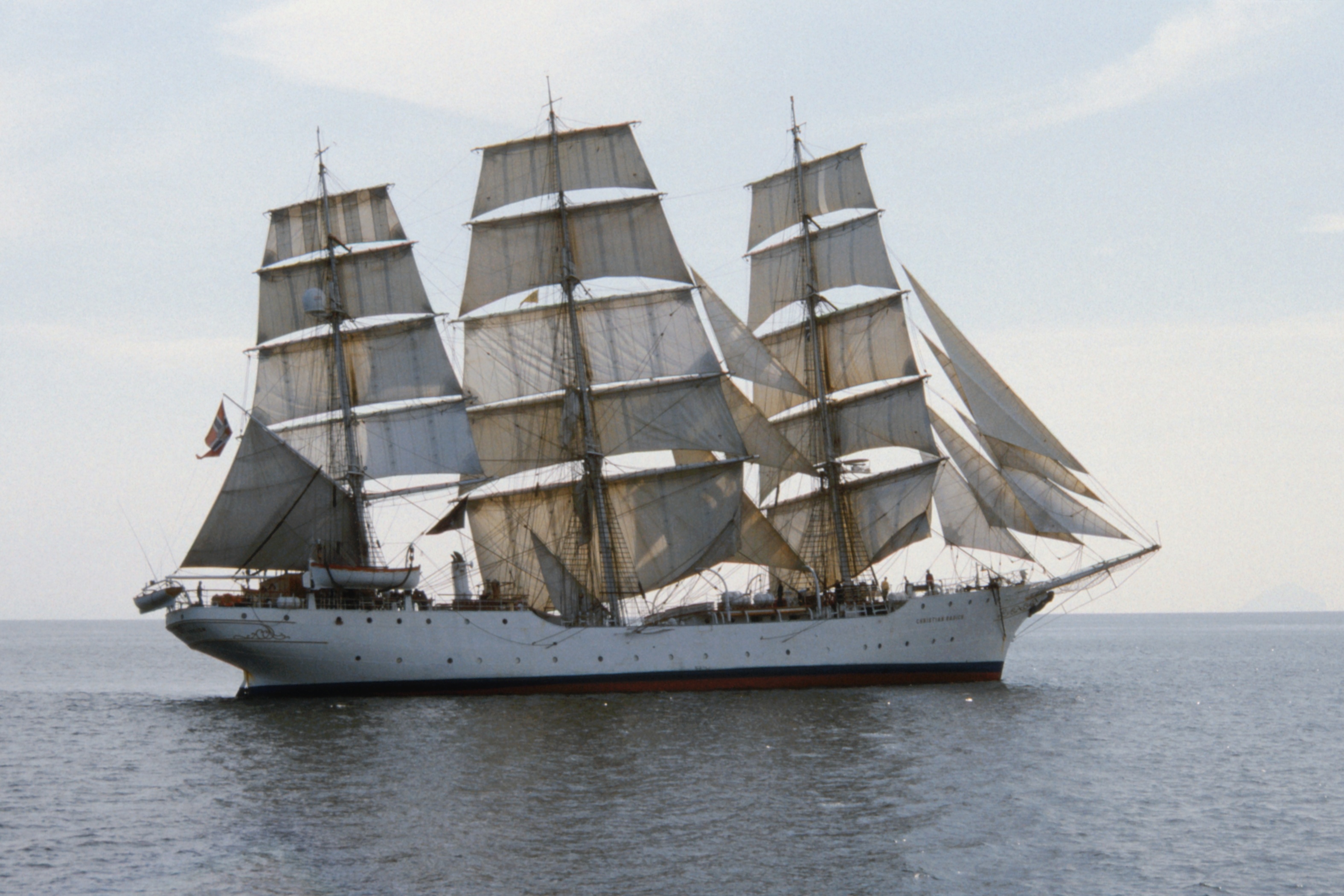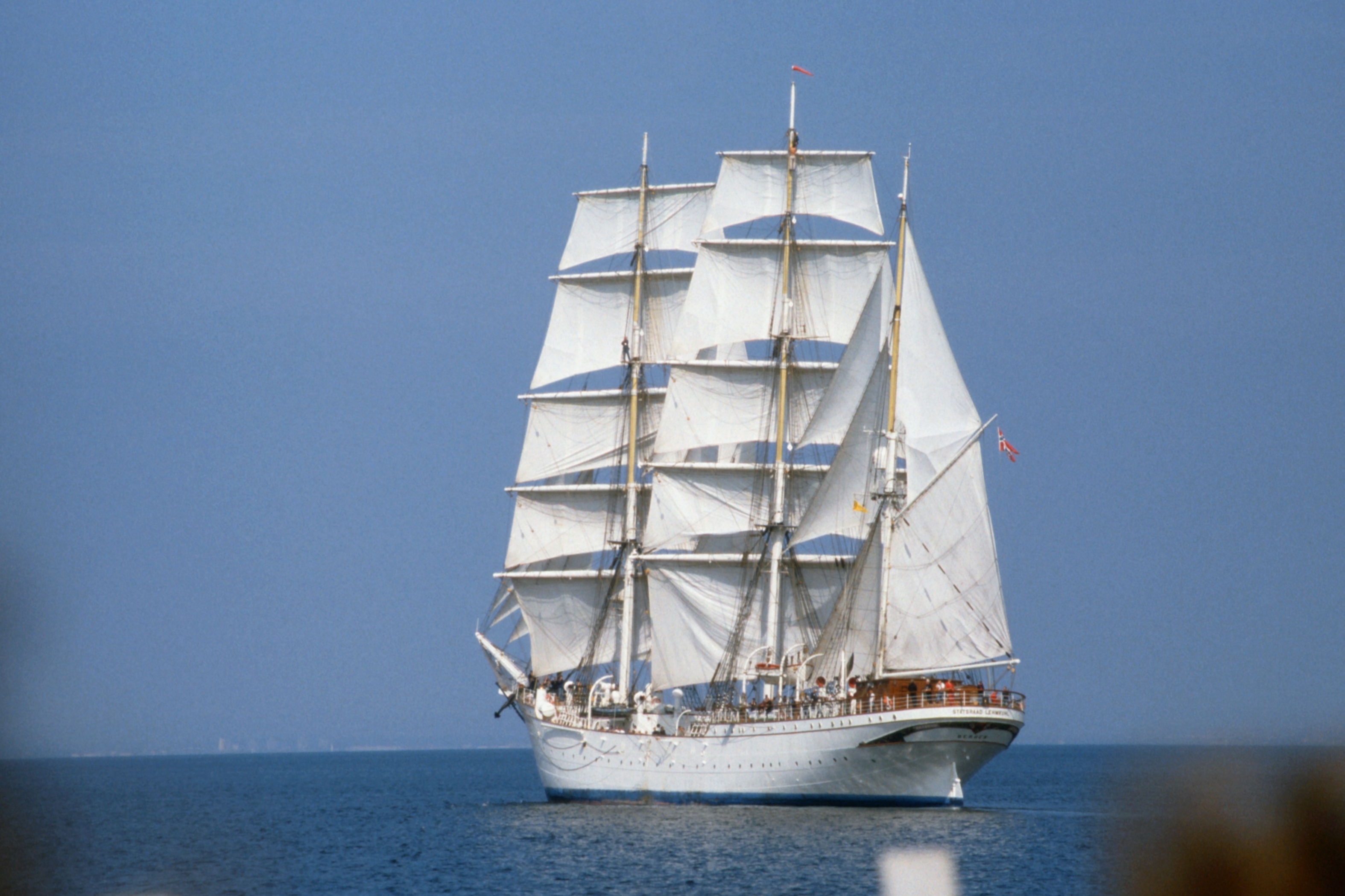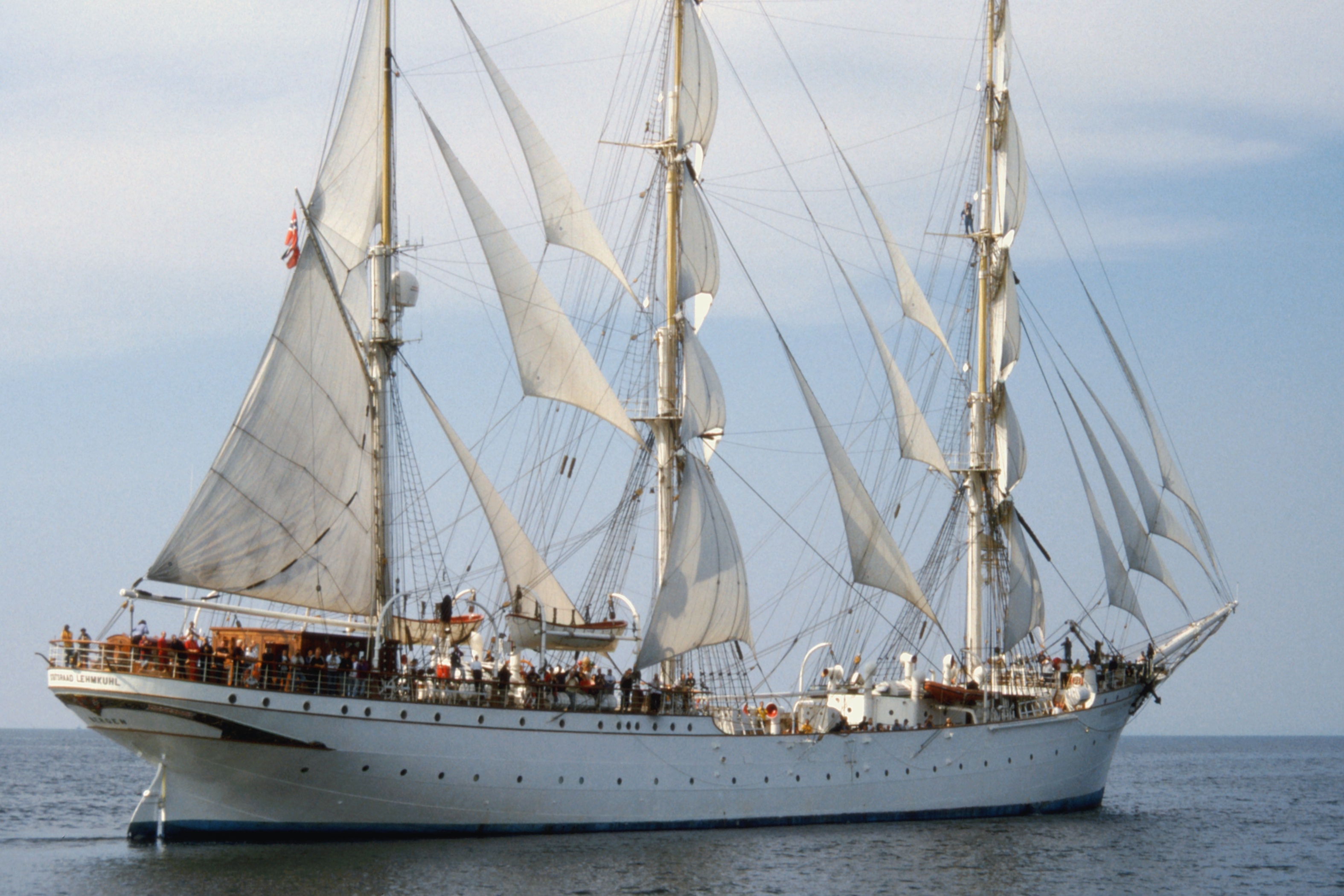 The vessel is 84.6m long (waterline), with a sparred length of 98m and a maximum width of 12.6m. She has a draught of about 5.2m and a displacement at full load of 1516 tons. Under engine power, the Statsraad Lehmkuhl reaches a top speed of 11 knots, while she can make up to 17 knots under sail. She has 22 sails with a total area of 2026 square metres.