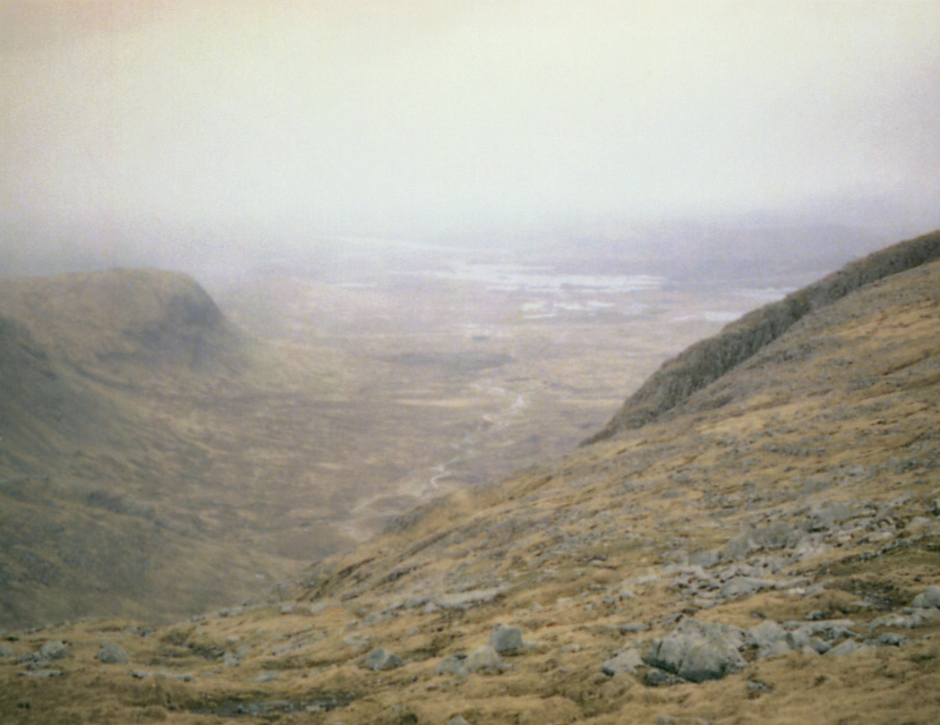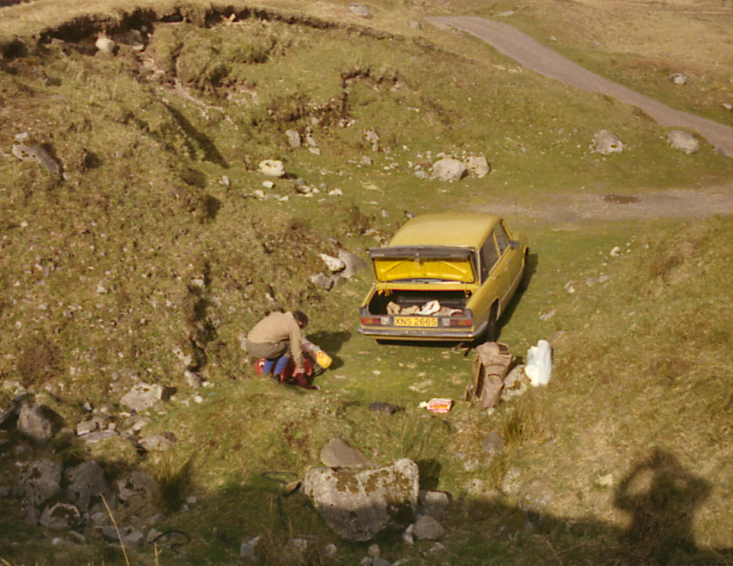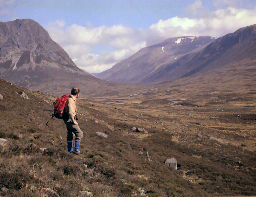 On Friday, May 1, Richard and I drove into Glen Etive in the late afternoon and set up a high camp, probably just over the watershed from the Allt Ceitlein (188478). The following morning, I think we went up Stob Ghabhar intending to go on to Clach Leathad but beat a hasty retreat in the face of sleet. We abandoned plans to stay for Stob Coir' an Albannaich on the morrow and ran to Glencoe YH for the night with failing lights. Had to call out the AA in the morning for a flat battery (faulty alternator).