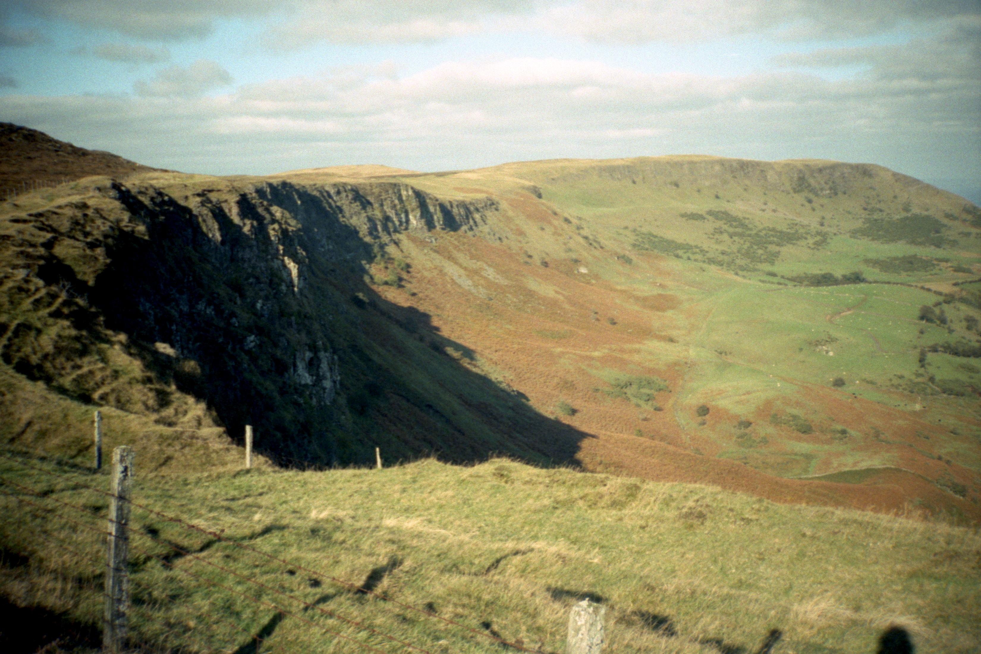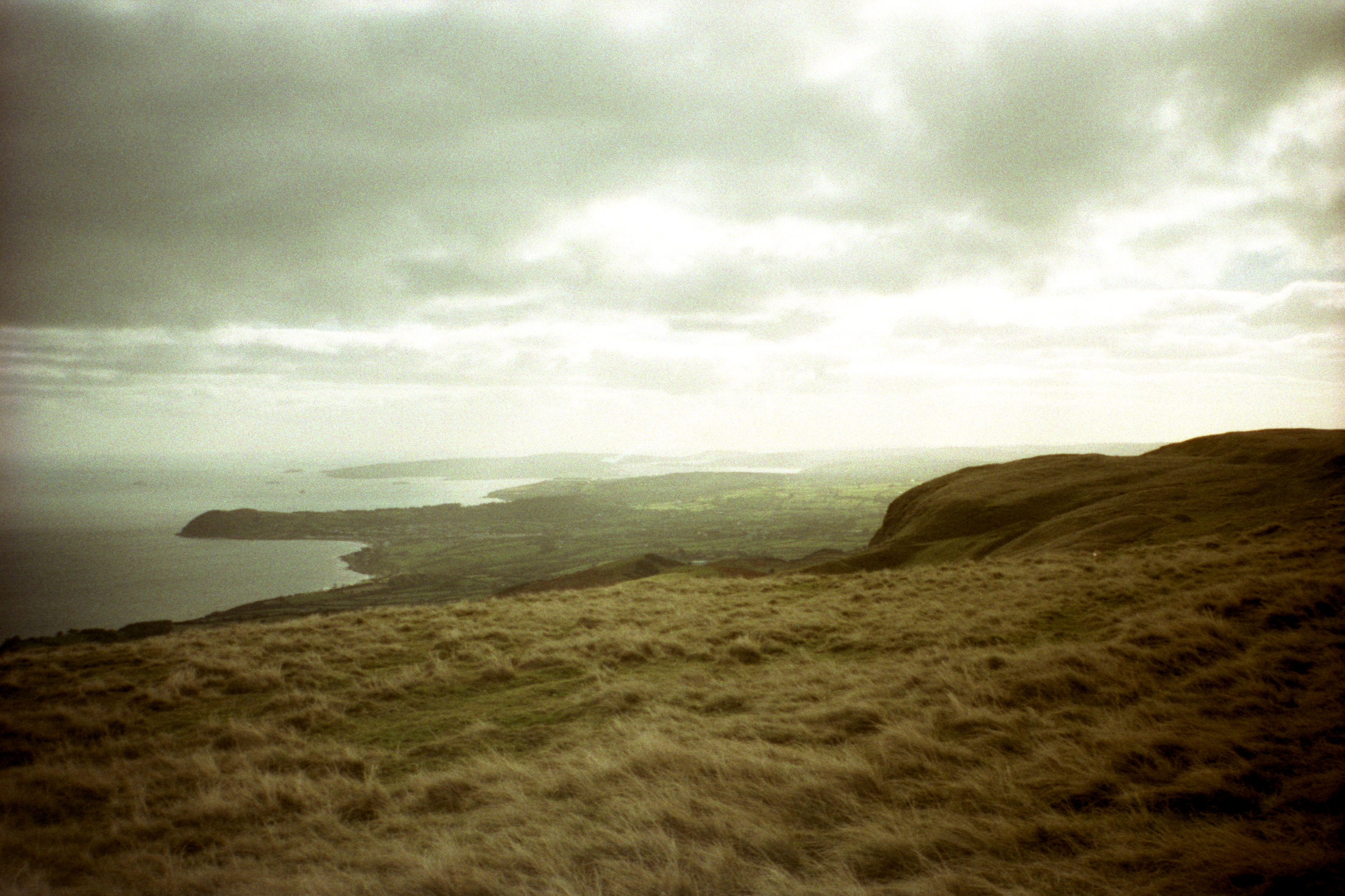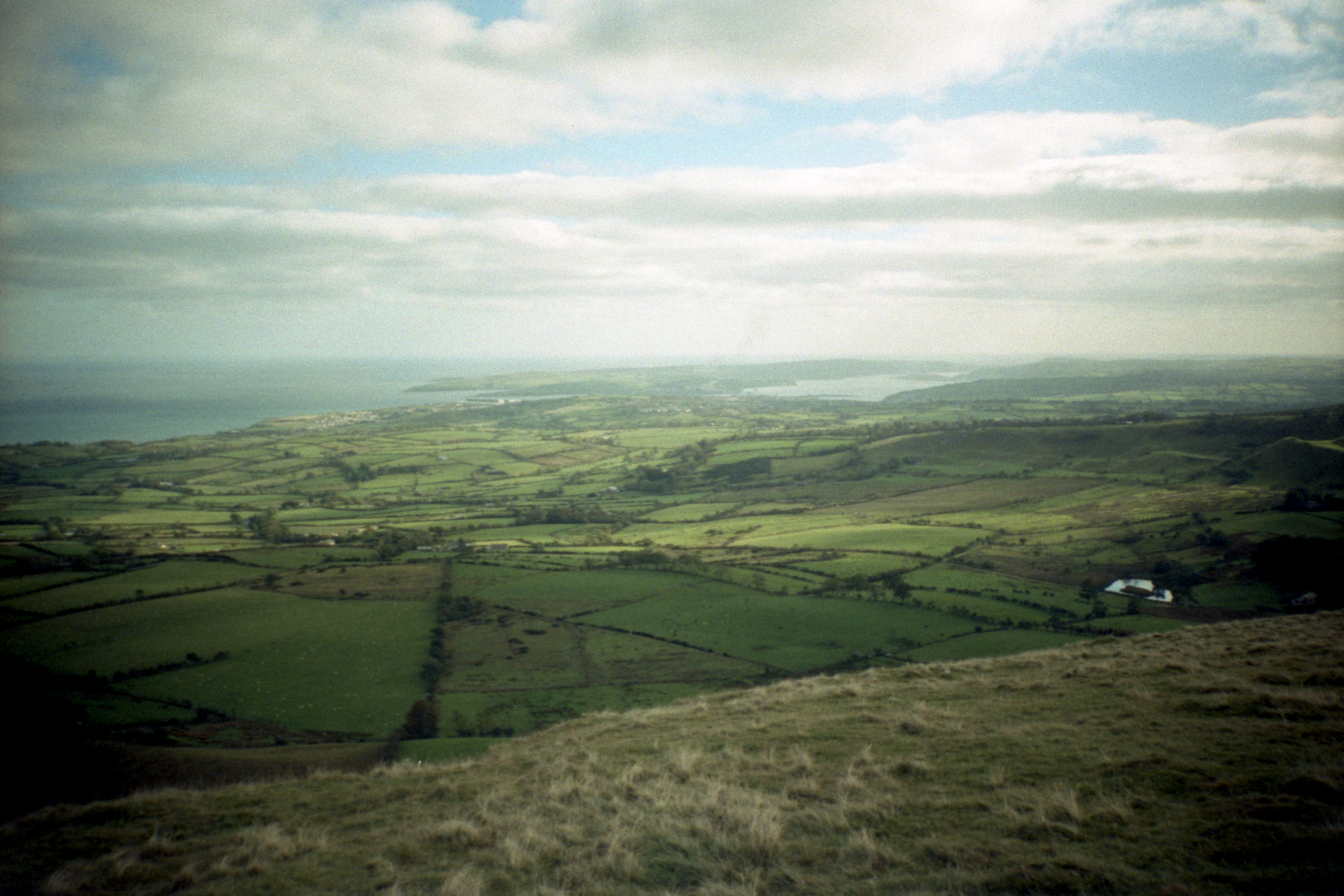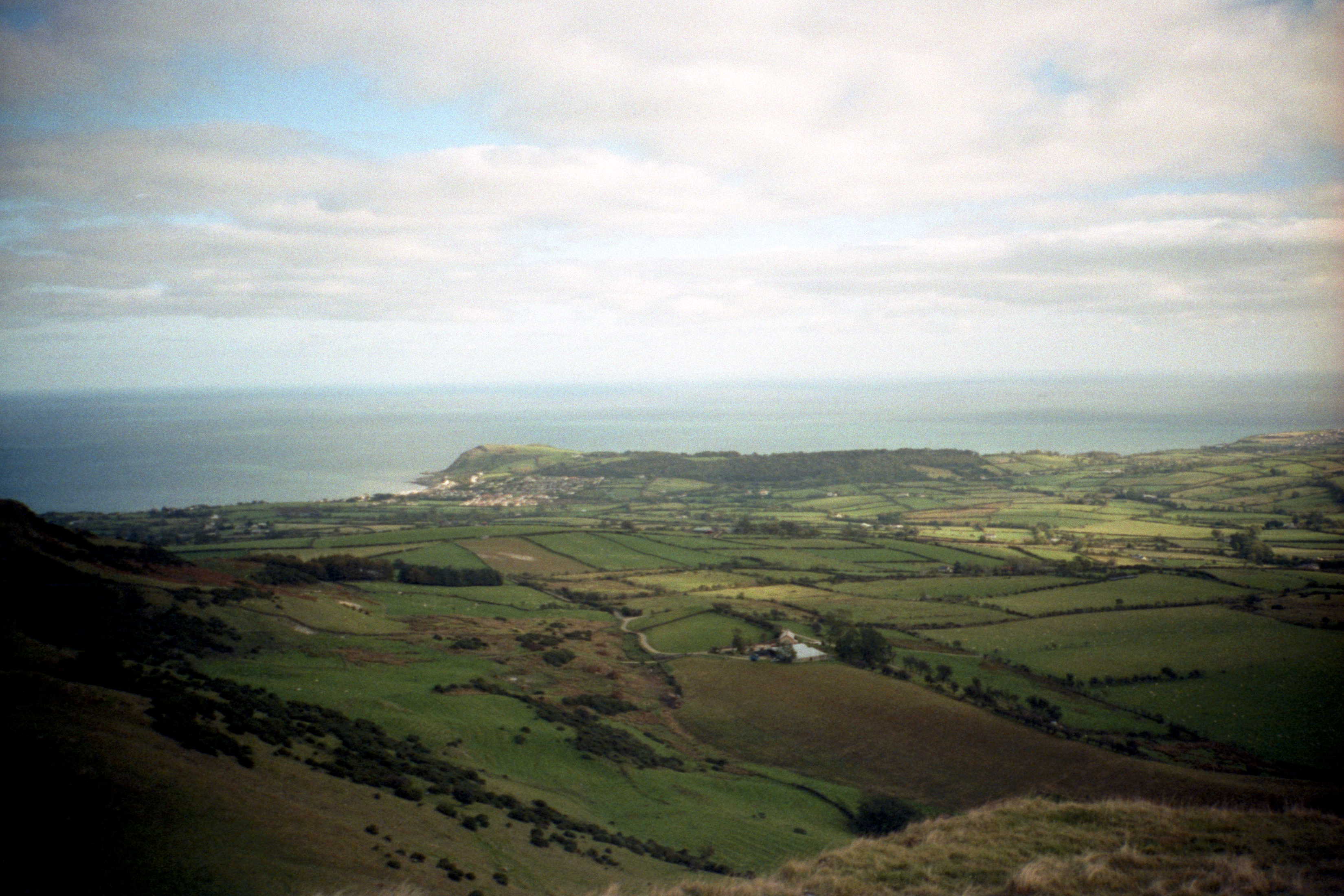 Looking back from Scawt Hill, I managed to convince myself that I could see the south end of Arran in addition to the other bits of Scotland. Sun dappled the patchwork of fields down to Ballygalley and towards Larne.